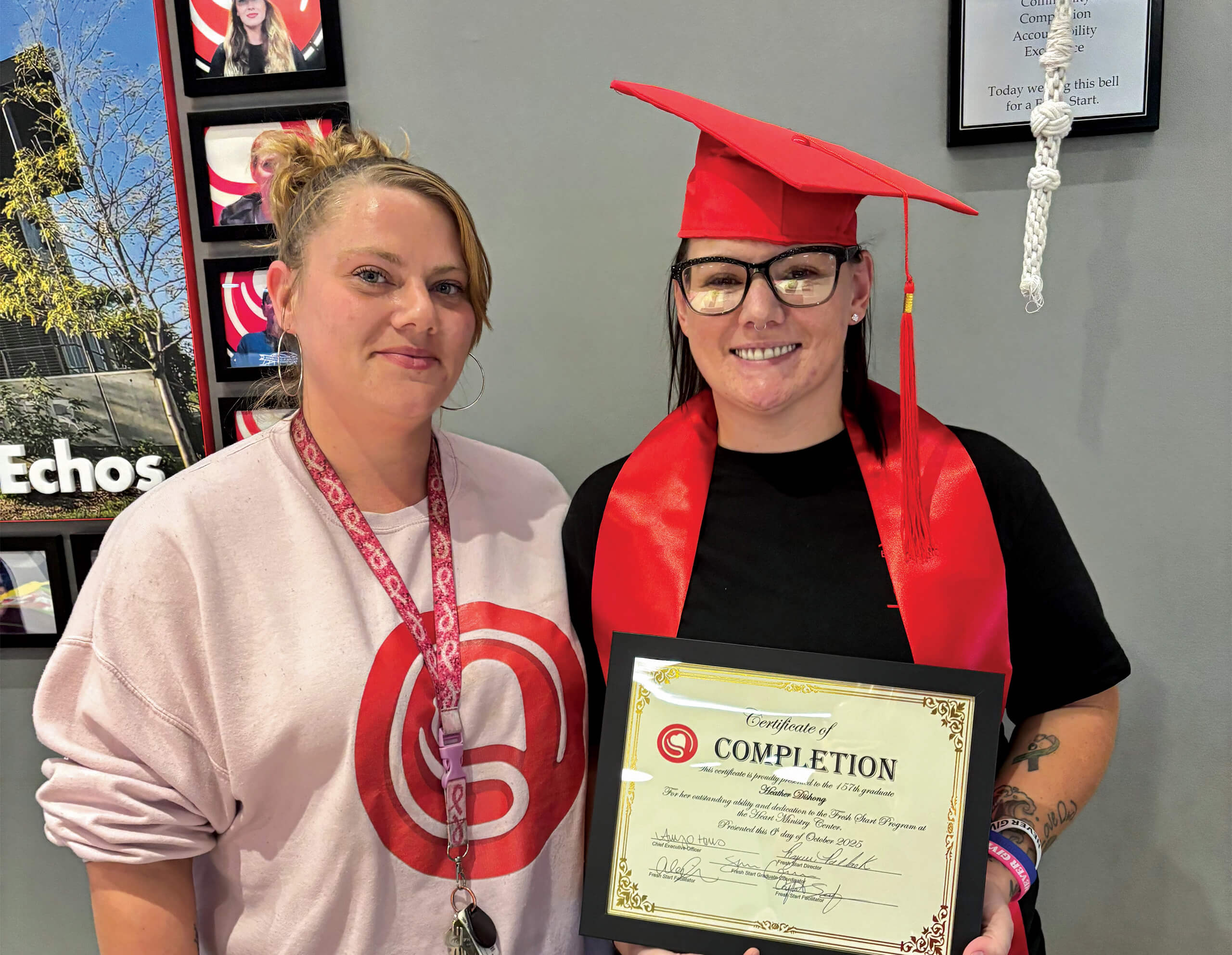Cheering erupts in the Heart lobby as the newest Fresh Start graduate rings the bell. The triumphant tug on the rope signals a successful completion of the training program and a hard-won fresh start. Each graduation marks a personal transformation and a network of support that continues well beyond the celebration. While every graduate brings their own story, they share the connection that their fresh start was built on community support and a belief that their goals are within reach.